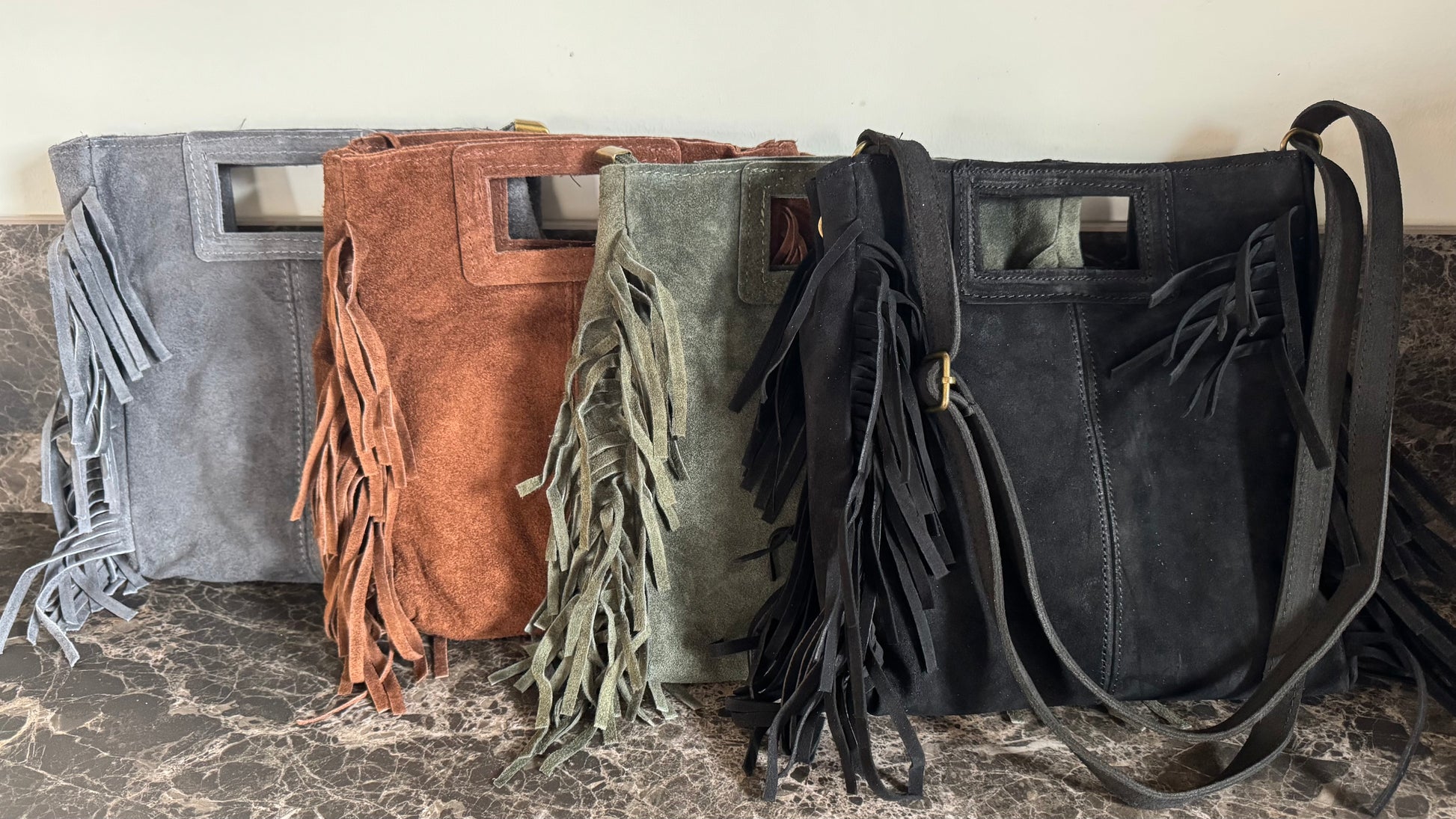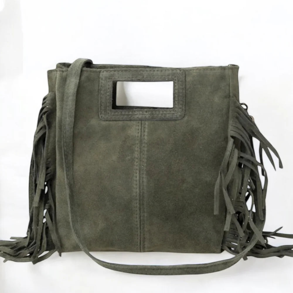 Borsa in suede e vera pelle da portare a mano o tracolla con frange