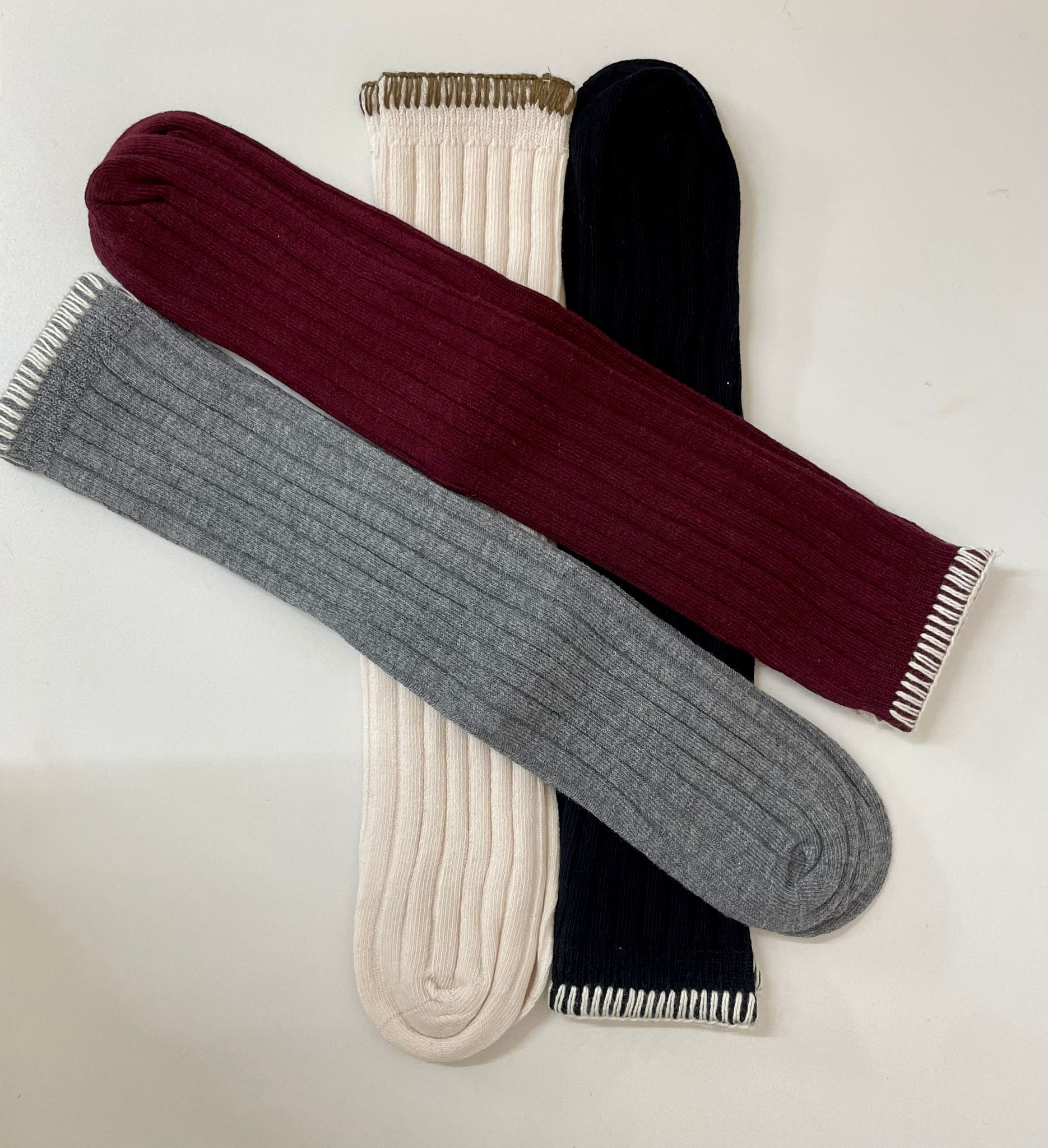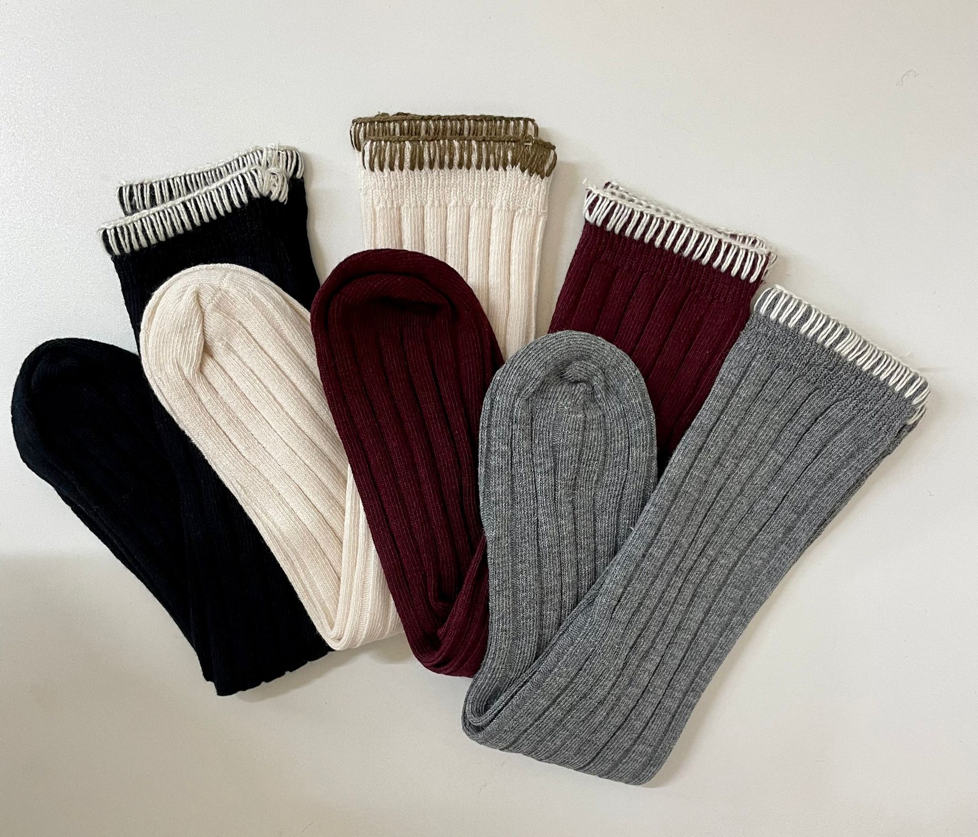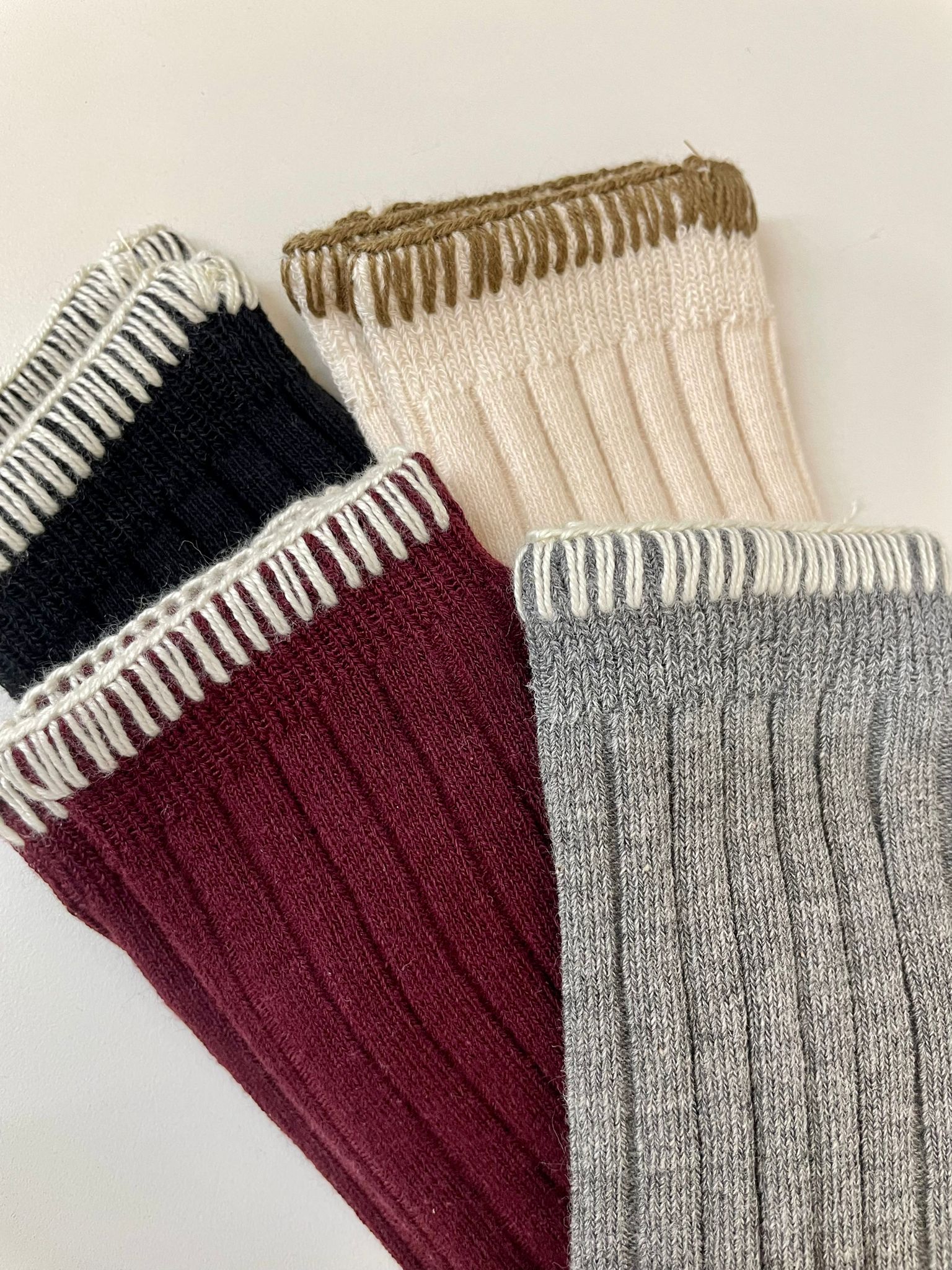 Calzino a costine con bordo superiore ricamato a contrasto. Altezza alla caviglia.