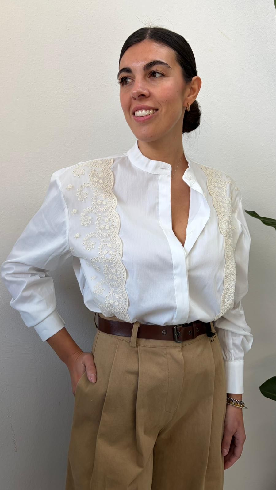 Camicia in cotone con pizzo a contrasto burro.