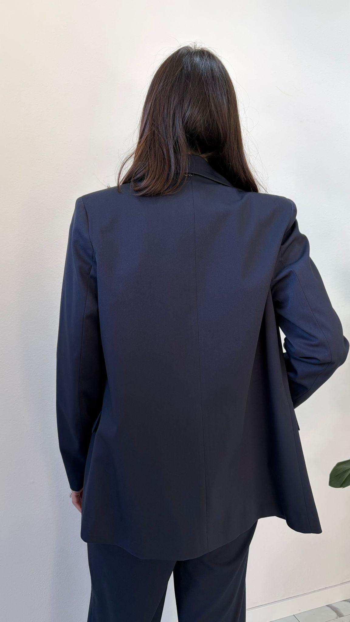Completo composto da giacca morbida dritta foderata e pantalone palazzo con tasche laterali ed elastico alla vita.