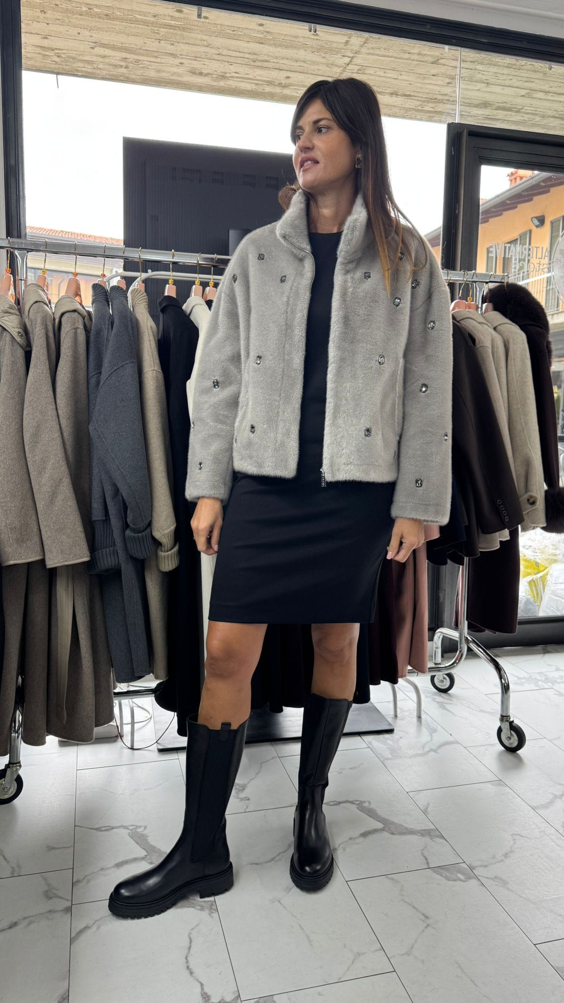 Giacca in pelliccia corta dal fascino glamour, impreziosita da applicazioni gioiello che donano luce e personalità al capo. La chiusura con zip frontale garantisce praticità mantenendo una linea moderna e sofisticata.