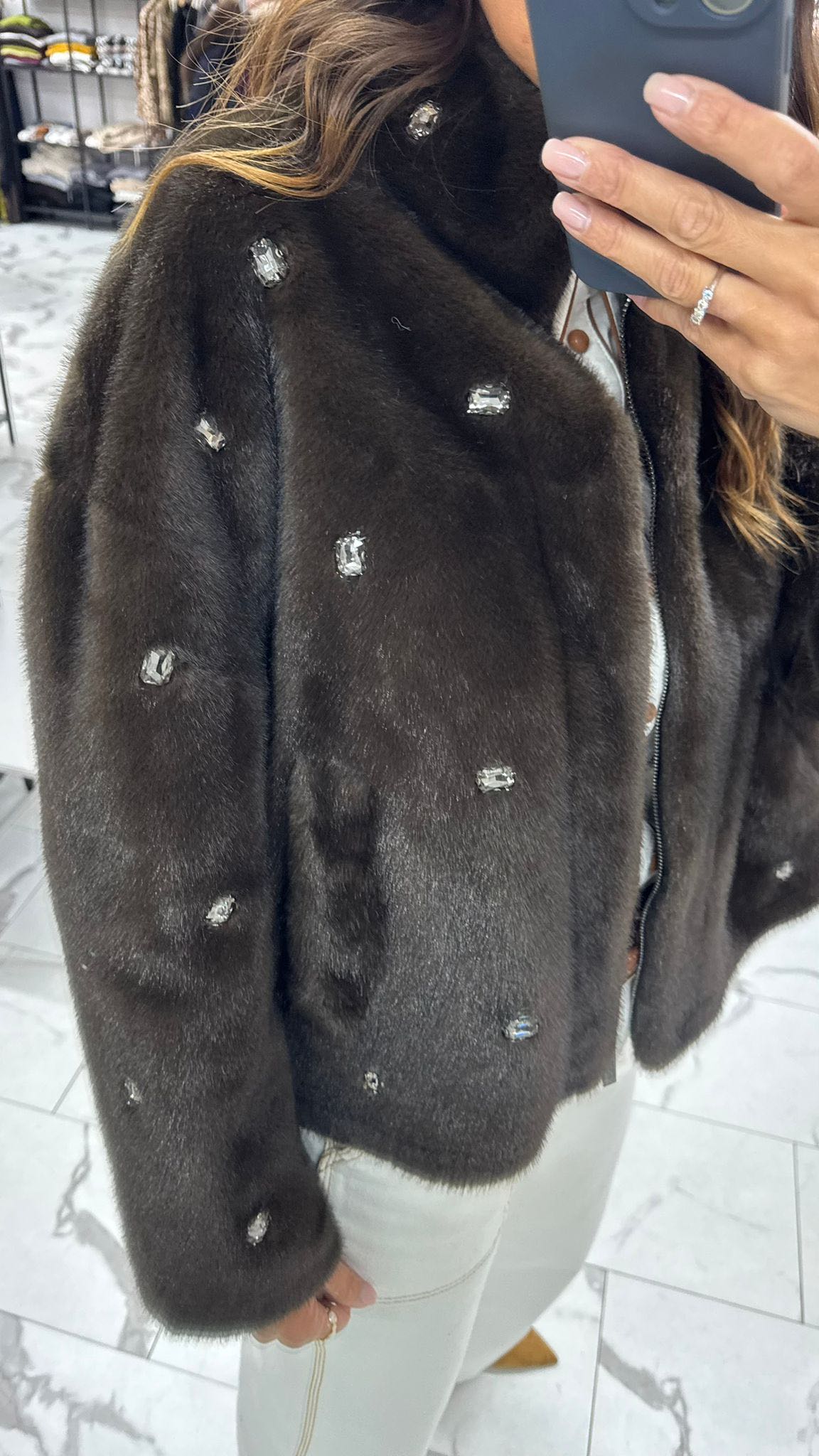 Giacca in pelliccia corta dal fascino glamour, impreziosita da applicazioni gioiello che donano luce e personalità al capo. La chiusura con zip frontale garantisce praticità mantenendo una linea moderna e sofisticata.