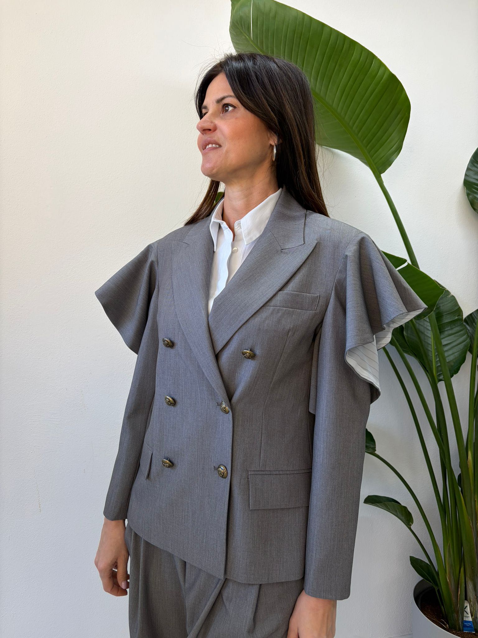 Giacca doppiopetto foderata con rouge e cut out alla manica.