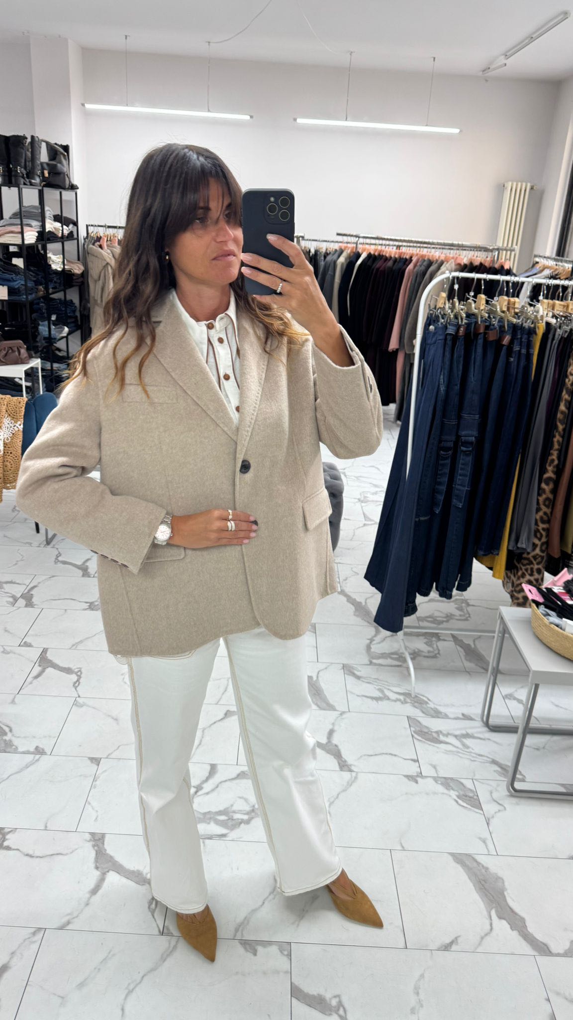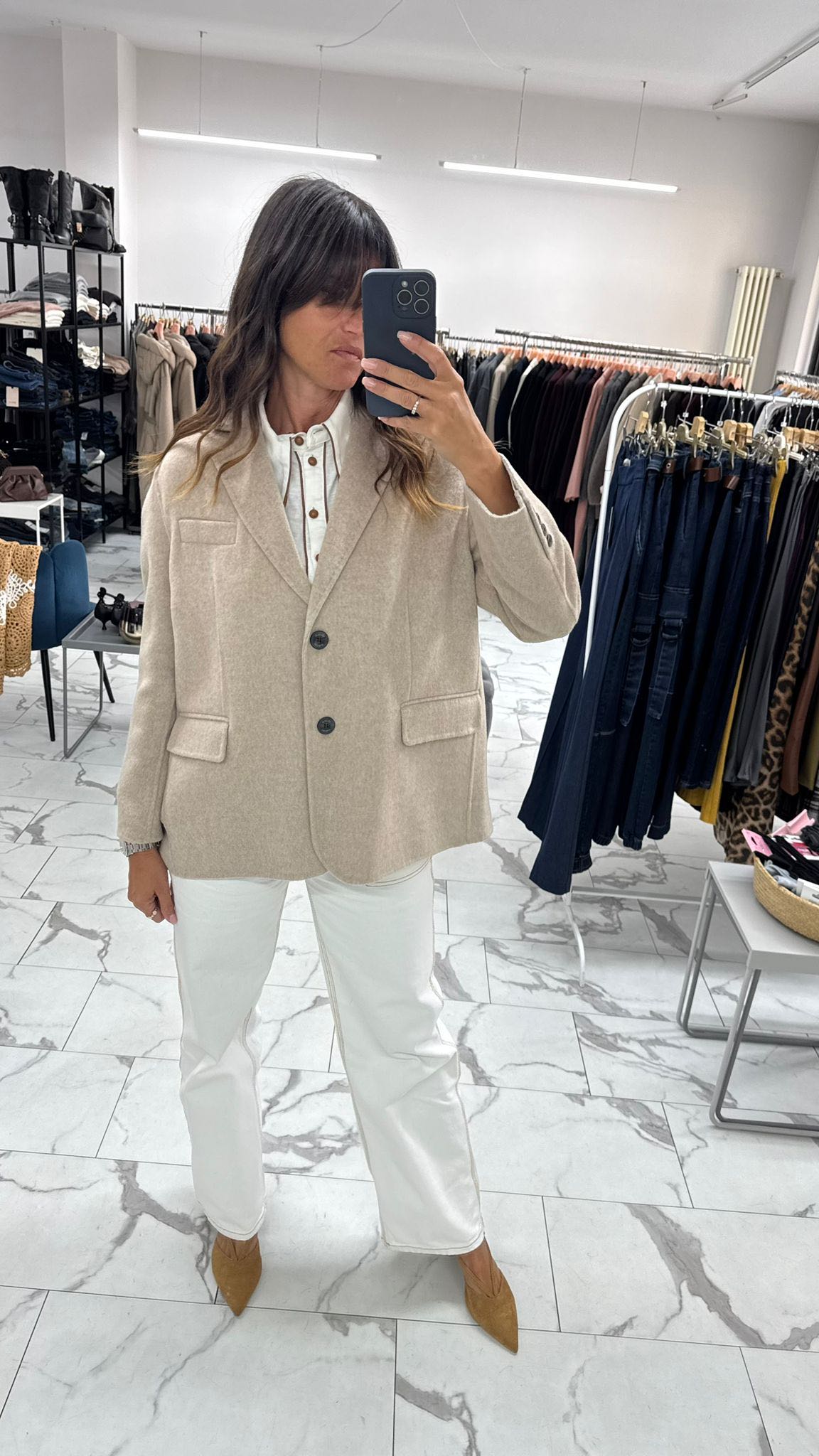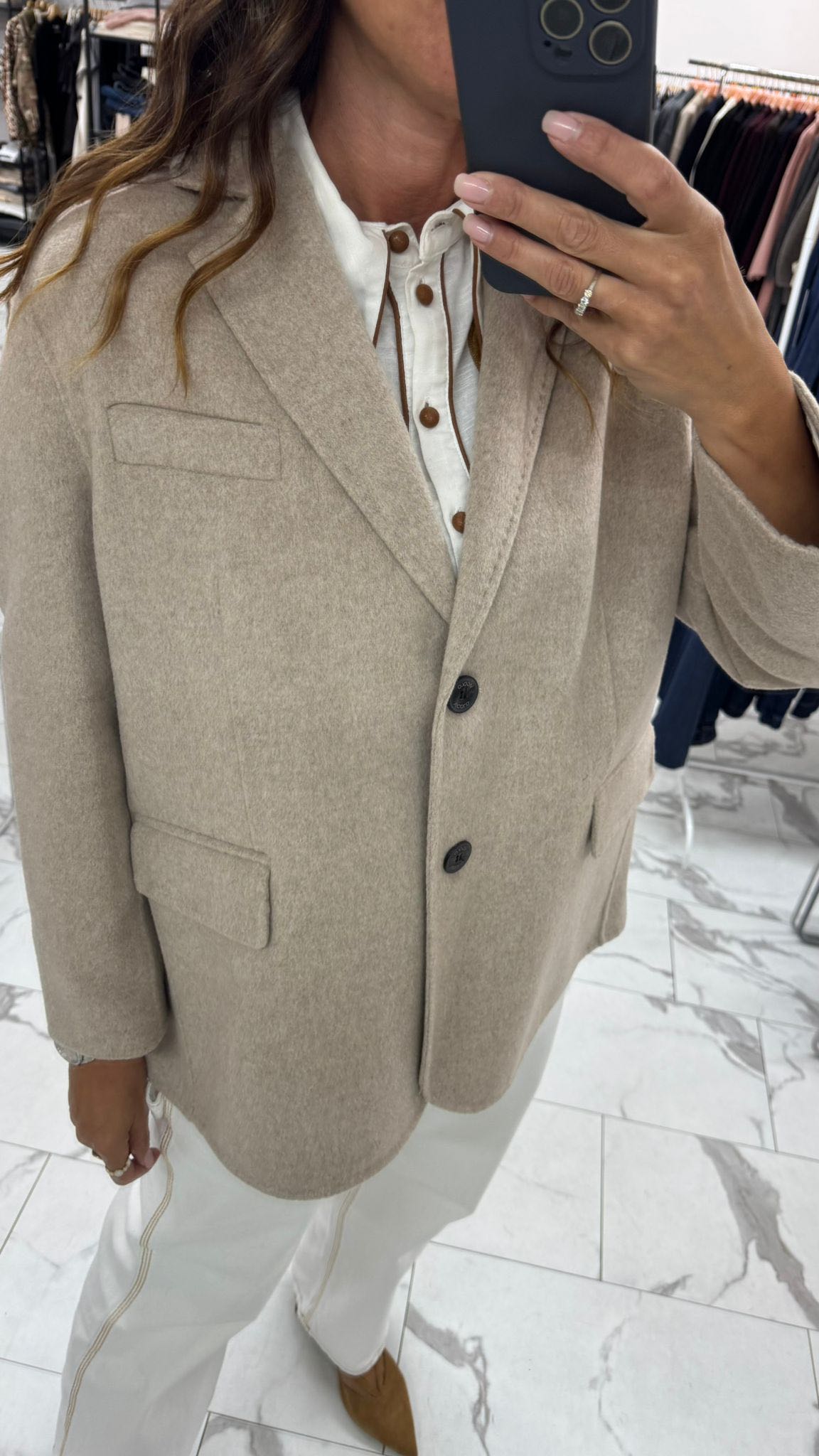 questa giacca over in panno è realizzata a mano per garantire qualità e cura nei dettagli. Il taglio morbido e la silhouette ampia la rendono perfetta per sovrapposizioni di stile. Presenta una chiusura a due bottoni, tasche frontali funzionali e un taschino discreto sul petto. Calda e versatile, è un capo essenziale per affrontare la stagione con classe e personalità.