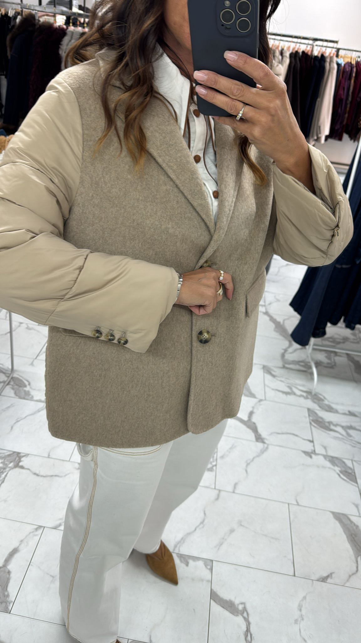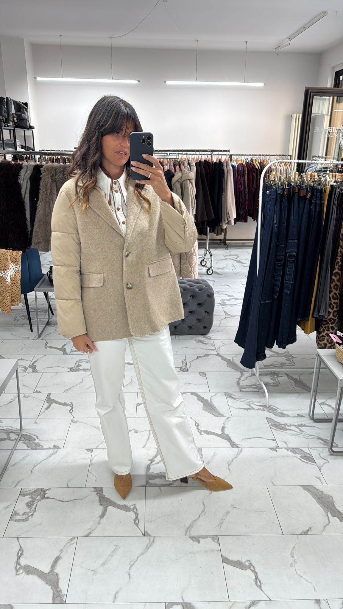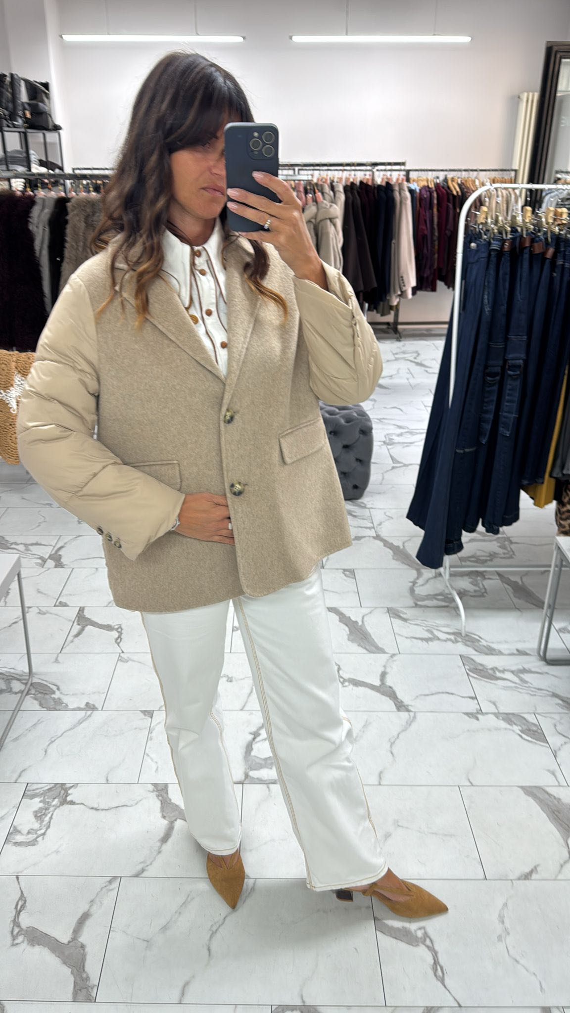 Giacca piumino dal design originale, caratterizzata da un petto in tessuto hand made in misto lana che dona al capo un tocco sartoriale e sofisticato. Il modello over assicura una vestibilità comoda e contemporanea, mentre la chiusura con due bottoni mantiene una linea essenziale. Il capo è sfoderato, perfetto per la mezza stagione, e dotato di pratiche tasche laterali. Un mix inedito di stile sportivo e dettagli sartoriali, ideale per chi ama distinguersi con discrezione.