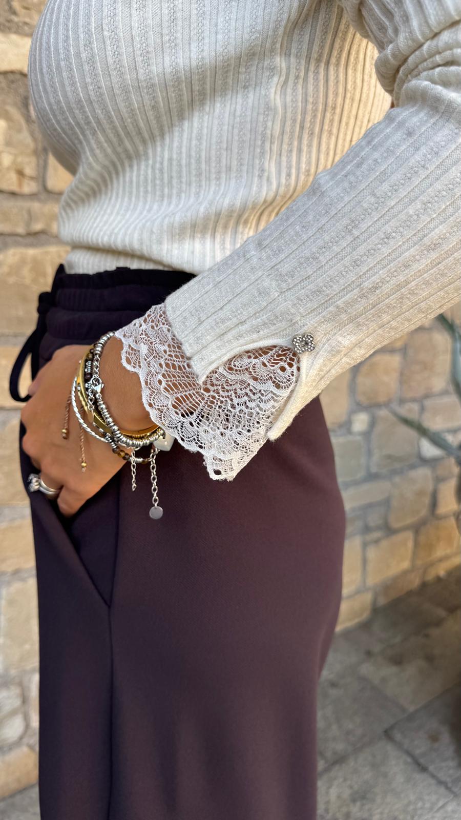 dettaglio manica con pizzo e bottone gioiello