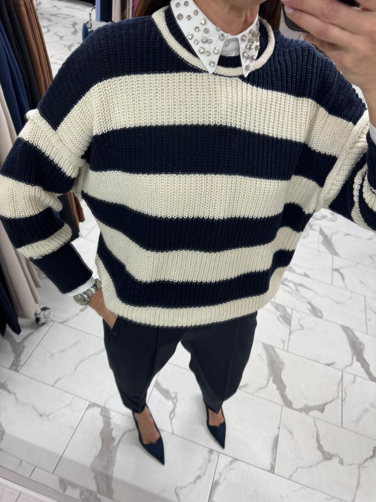 Maglioncino girocollo rigato blu e panna