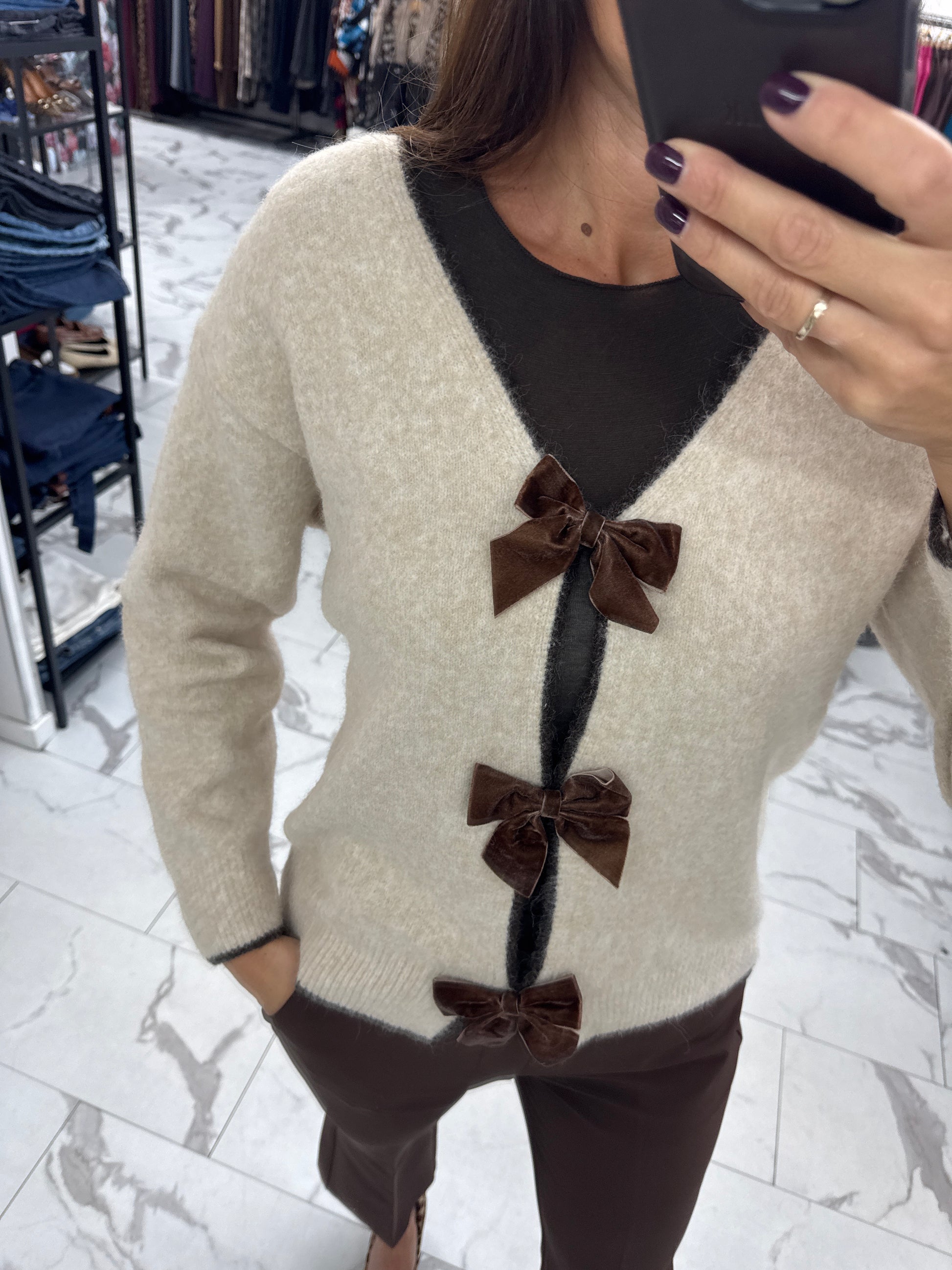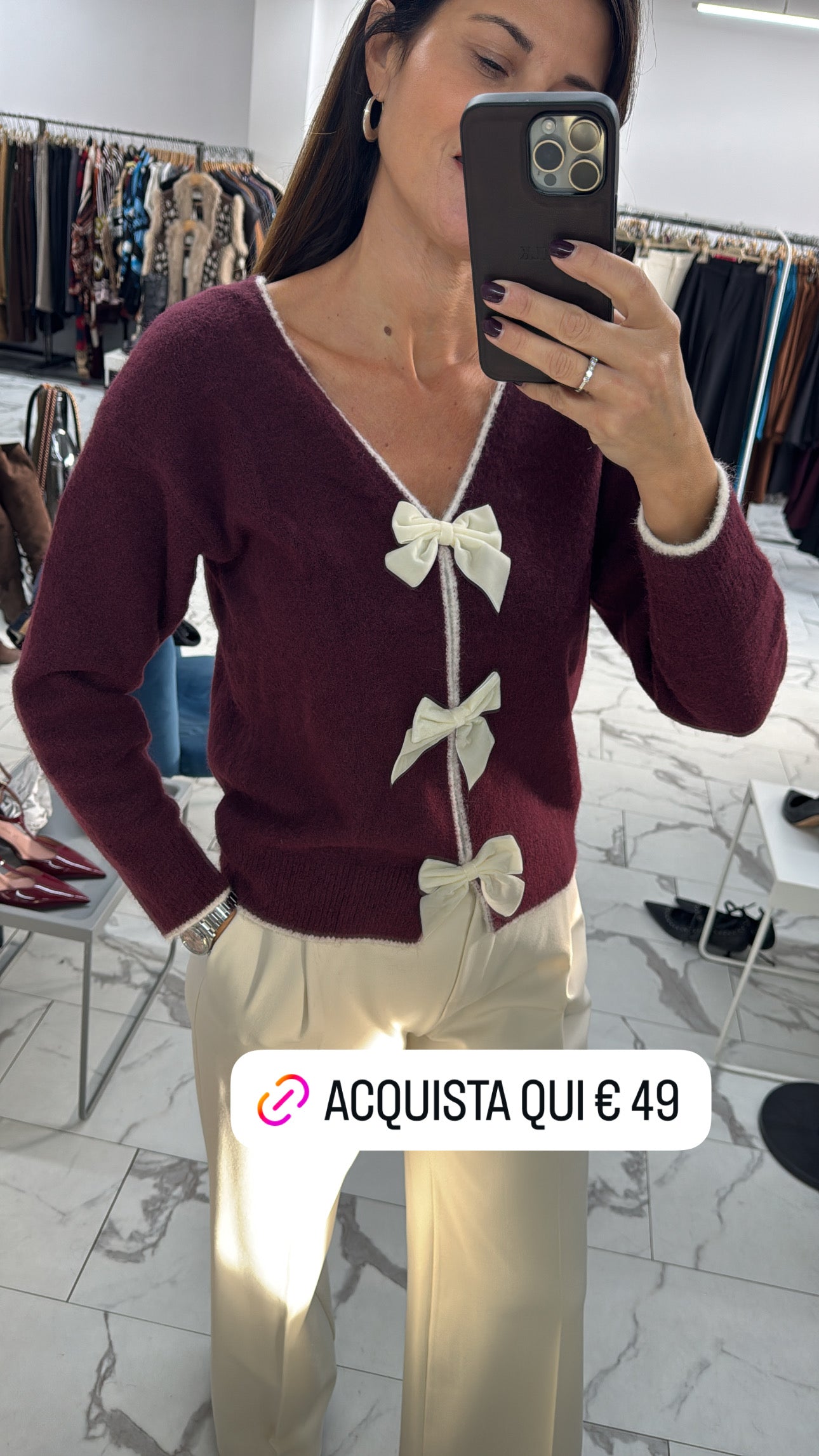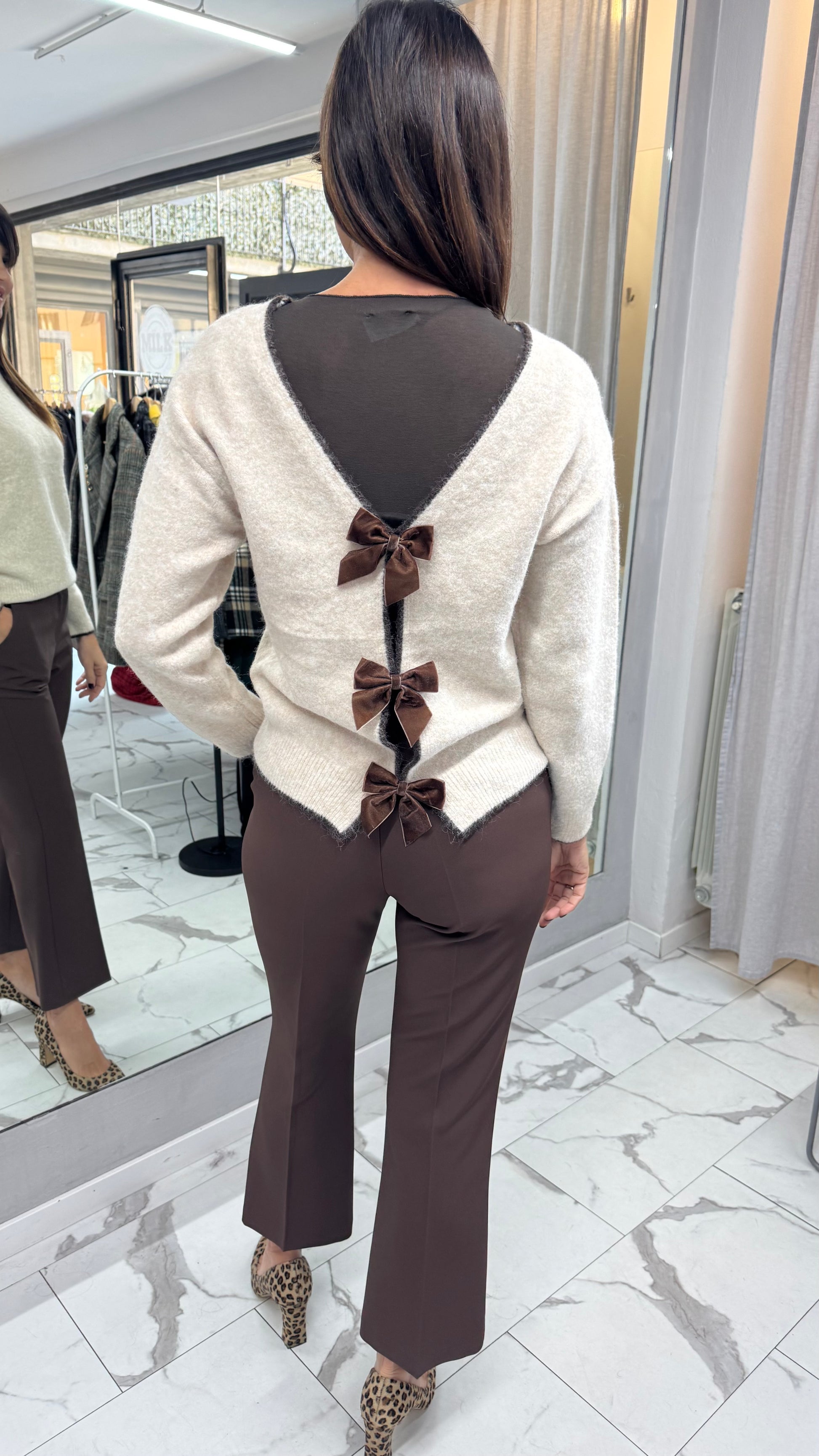 MAGLIONCINO SCOLLO V FIOCCHI sabbia/bordeaux/cioccolato