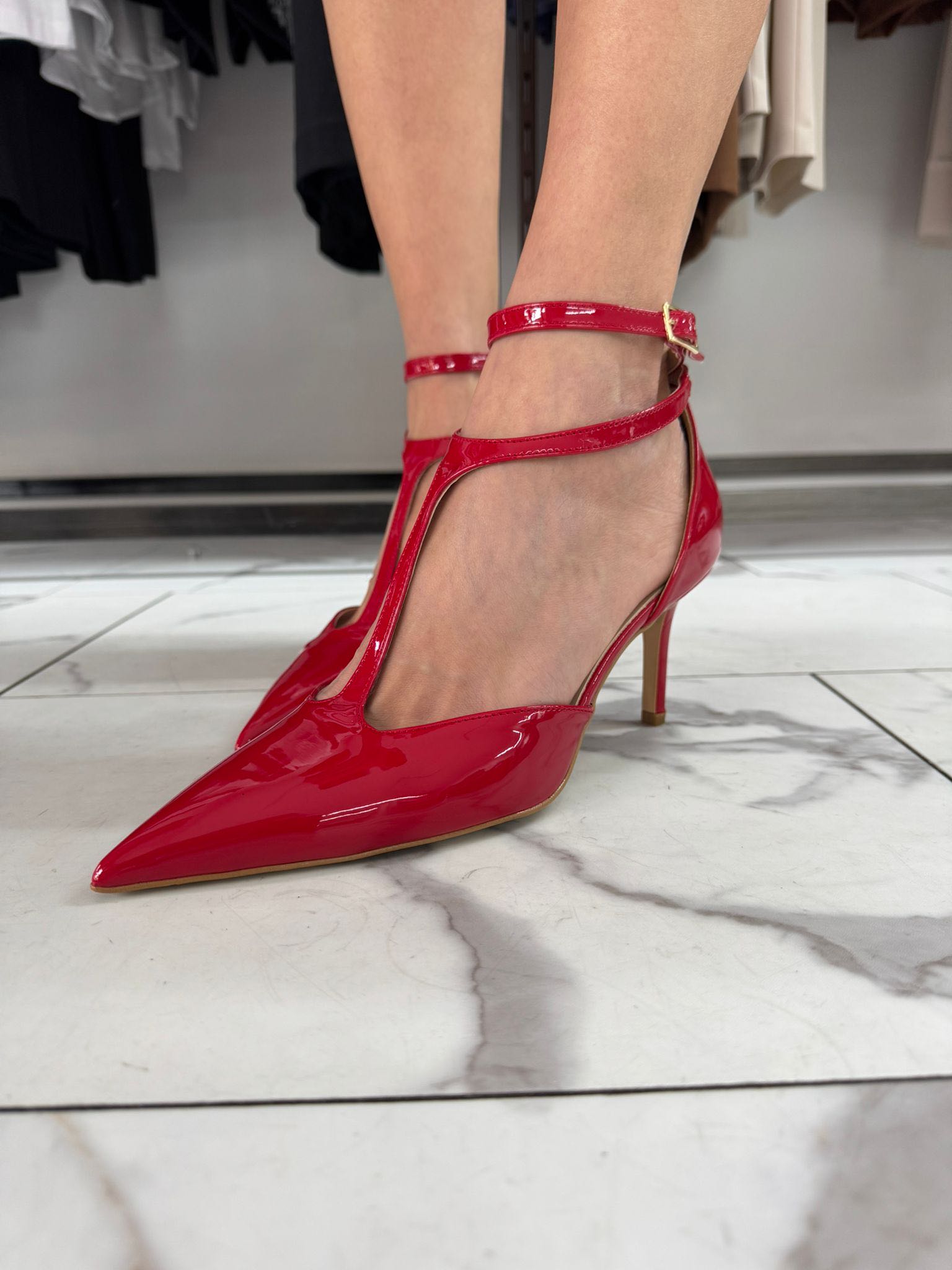 Tanghera in vernice con doppio cinturino alla caviglia